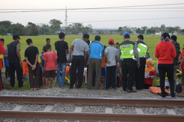 SEORANG PRIA BERUSIA 32 TAHUN TEWAS TERSAMBAR KERETA DI PERLINTASAN KERETA API GROMPOL, DESA KALIWULUH, KECAMATAN KEBAKKRAMAT, KABUPATEN KARANGANYAR, JAWA TENGAH, AKIBATNYA KORBAN MEREGANG NYAWA KARENA MENGALAMI LUKA CUKUP PARAH DI BAGIAN KEPALA .
